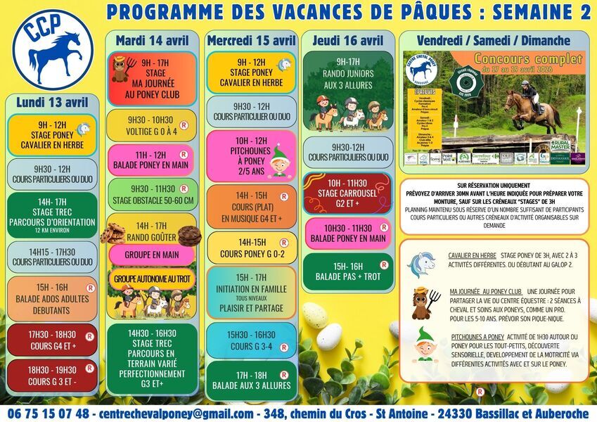 Voici le programme des activités du CCP la semaine prochaine. N'oubliez pas le concours de hunter derby jeudi (accès gratuit, buvette et snacking sur place). A très vite.