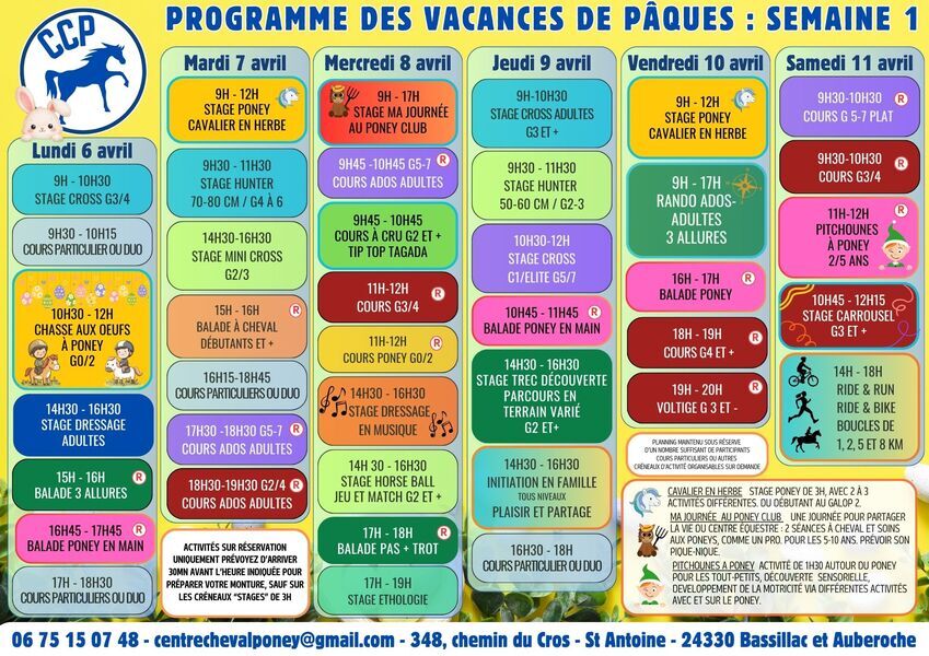A noter cette semaine et la suivante : un stage multiactivités de 5 jours, pour les cavaliers de niveau galop 1 à 4, de 9h à 17h du lundi au vendredi.