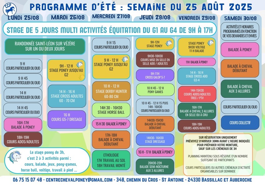 A noter cette semaine et la suivante : un stage multiactivités de 5 jours, pour les cavaliers de niveau galop 1 à 4, de 9h à 17h du lundi au vendredi.
